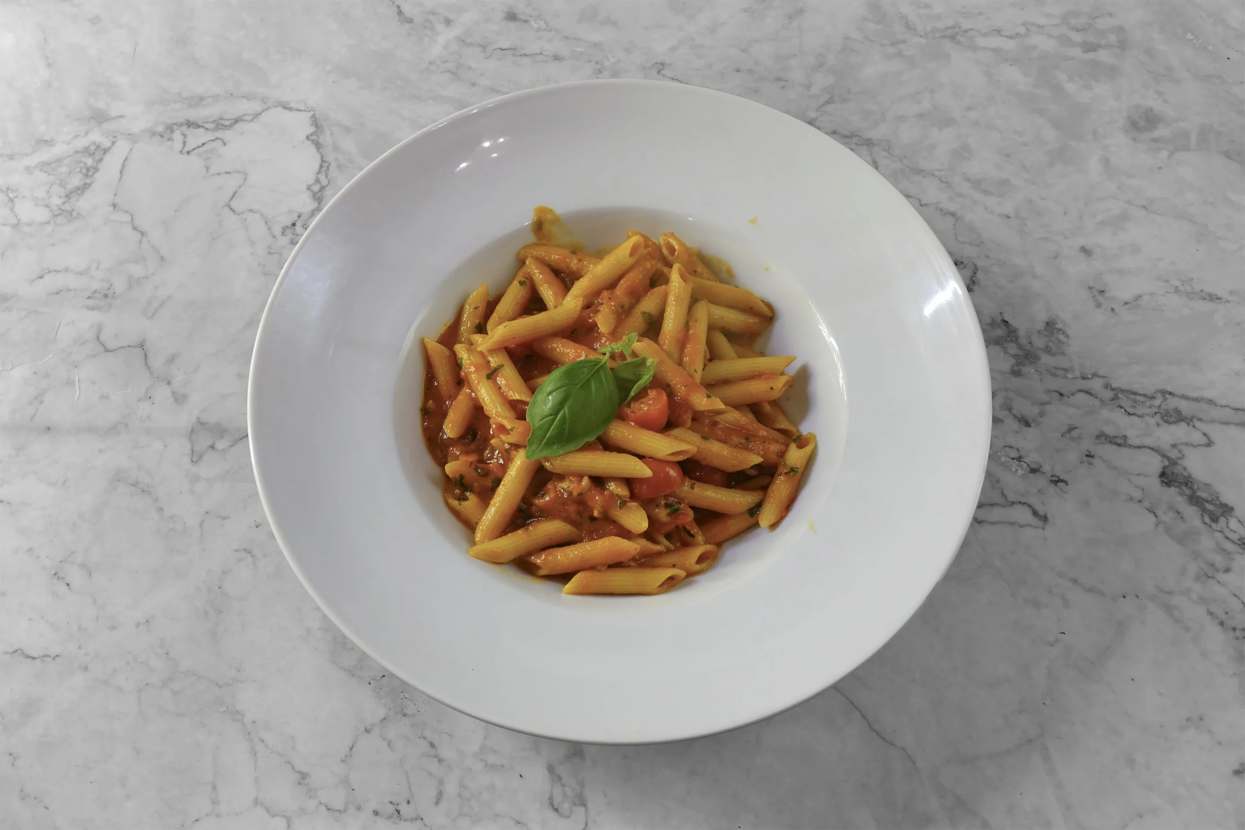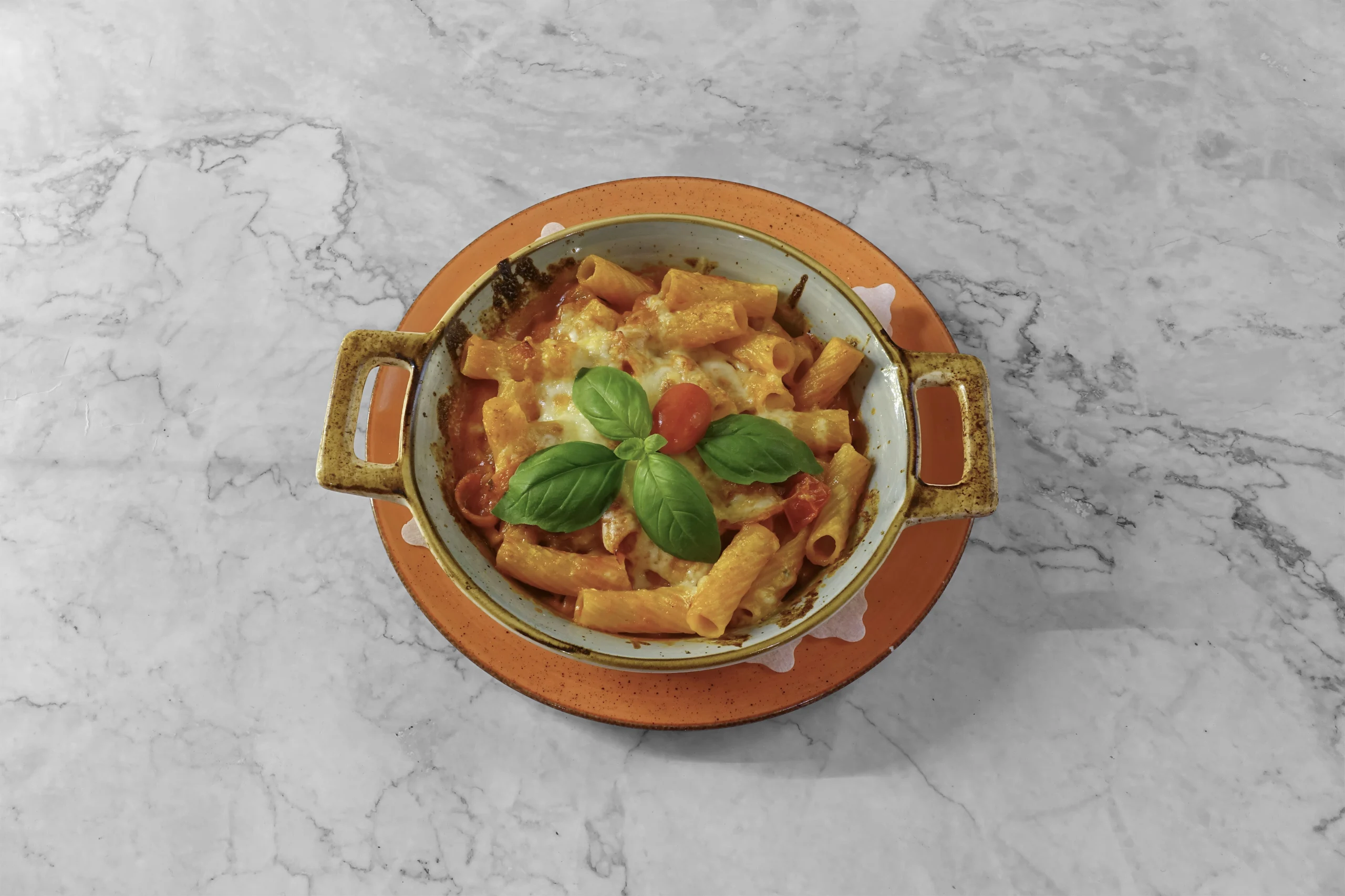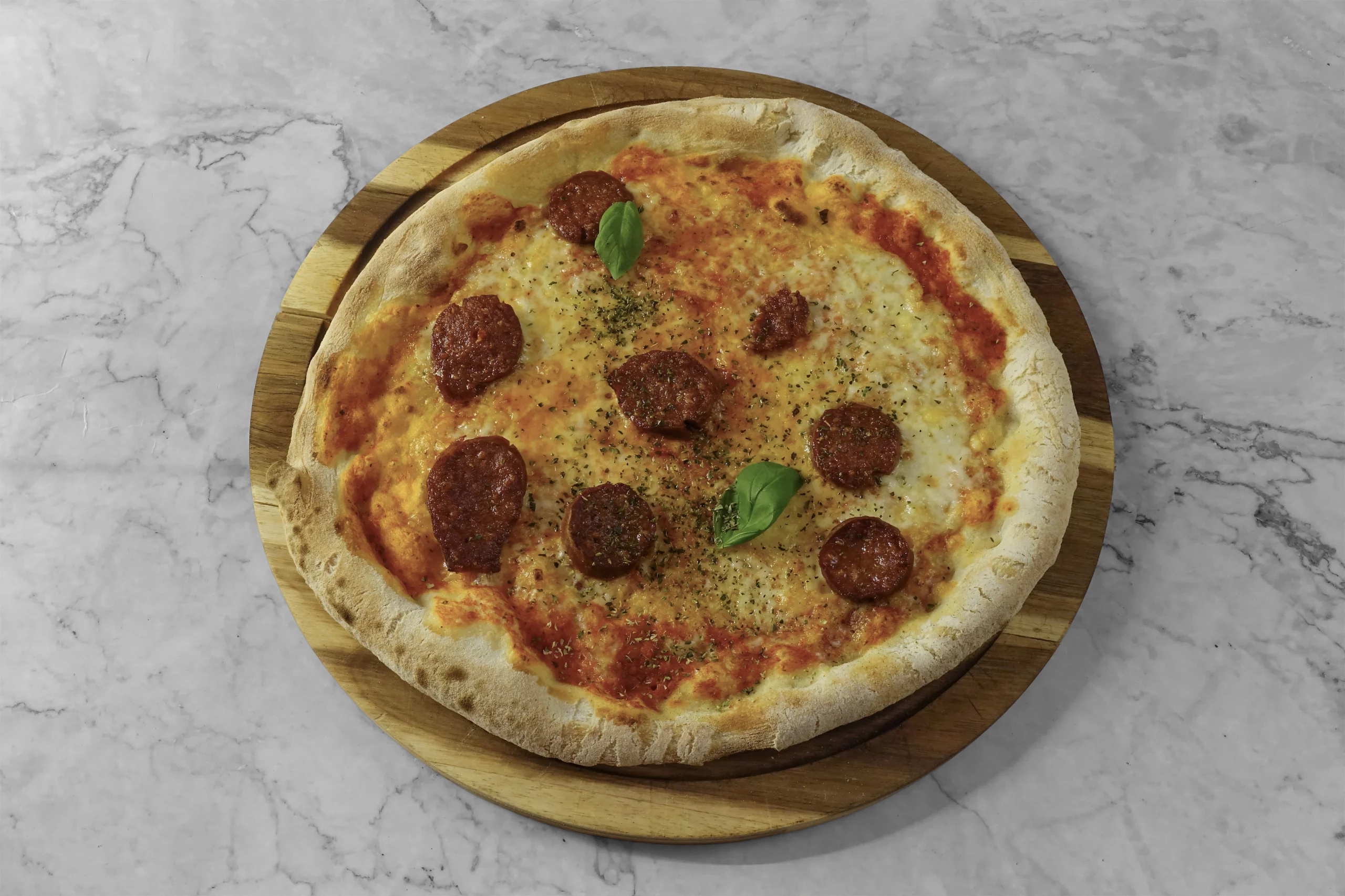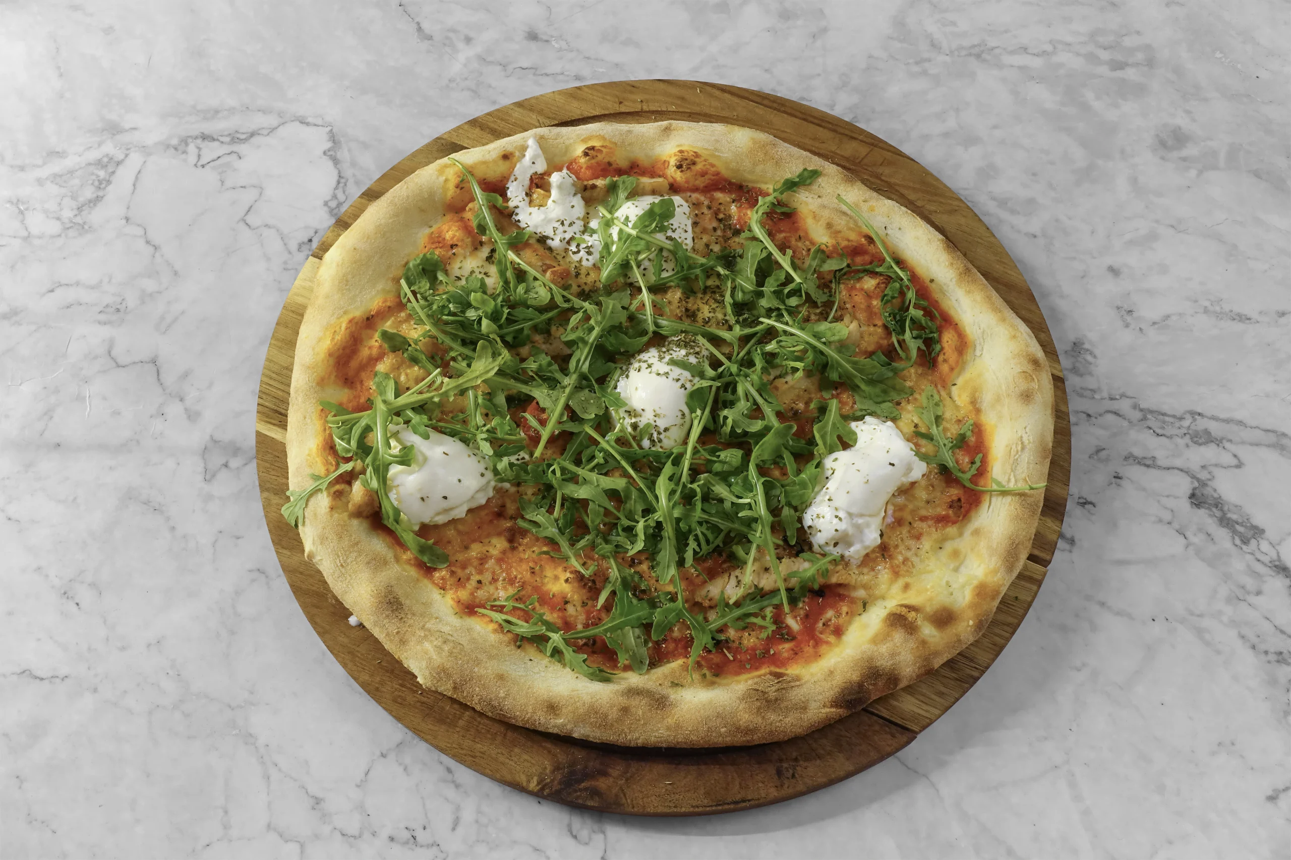 Tomatensoße, cremiger Mozzarella di Bufala, frischer Rucola, sonnenverwöhnte Tomaten und zarte Putenstreifen