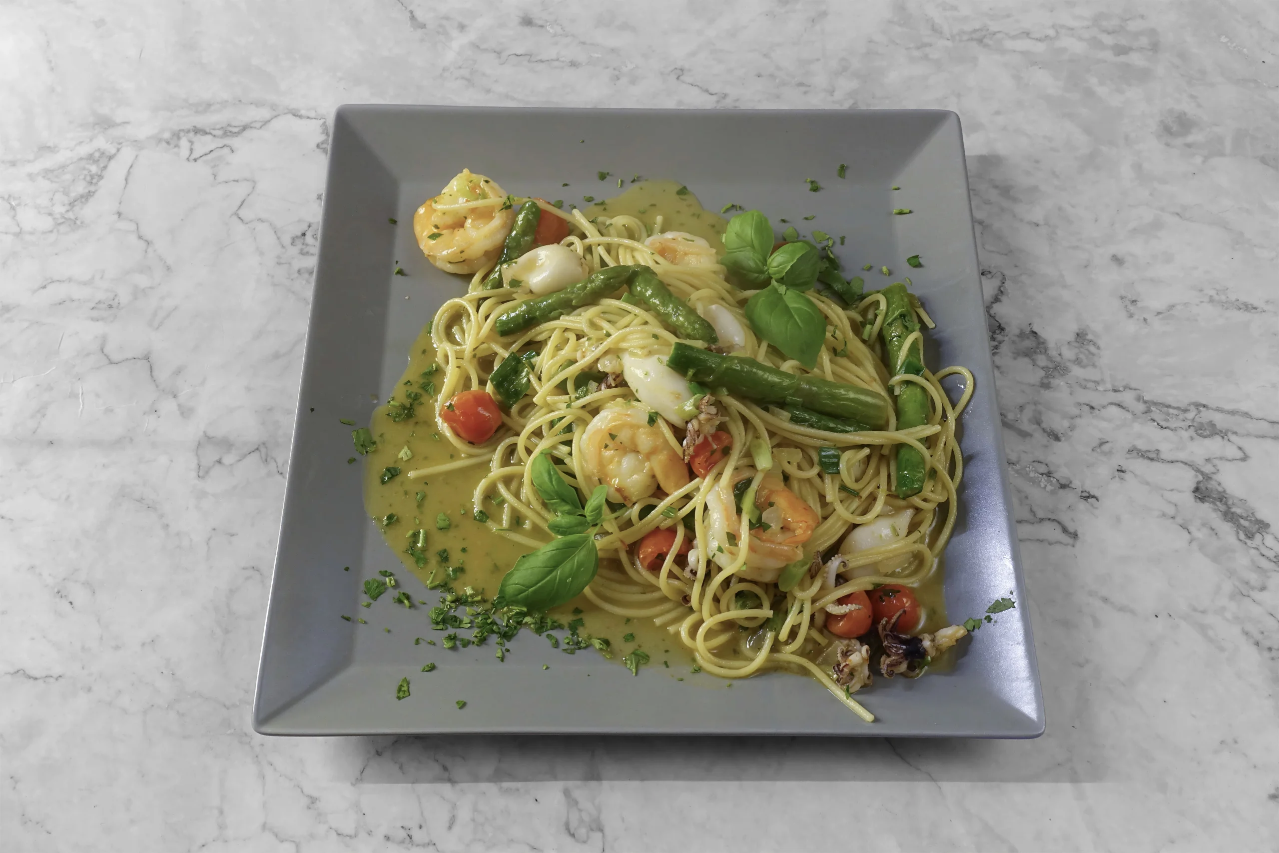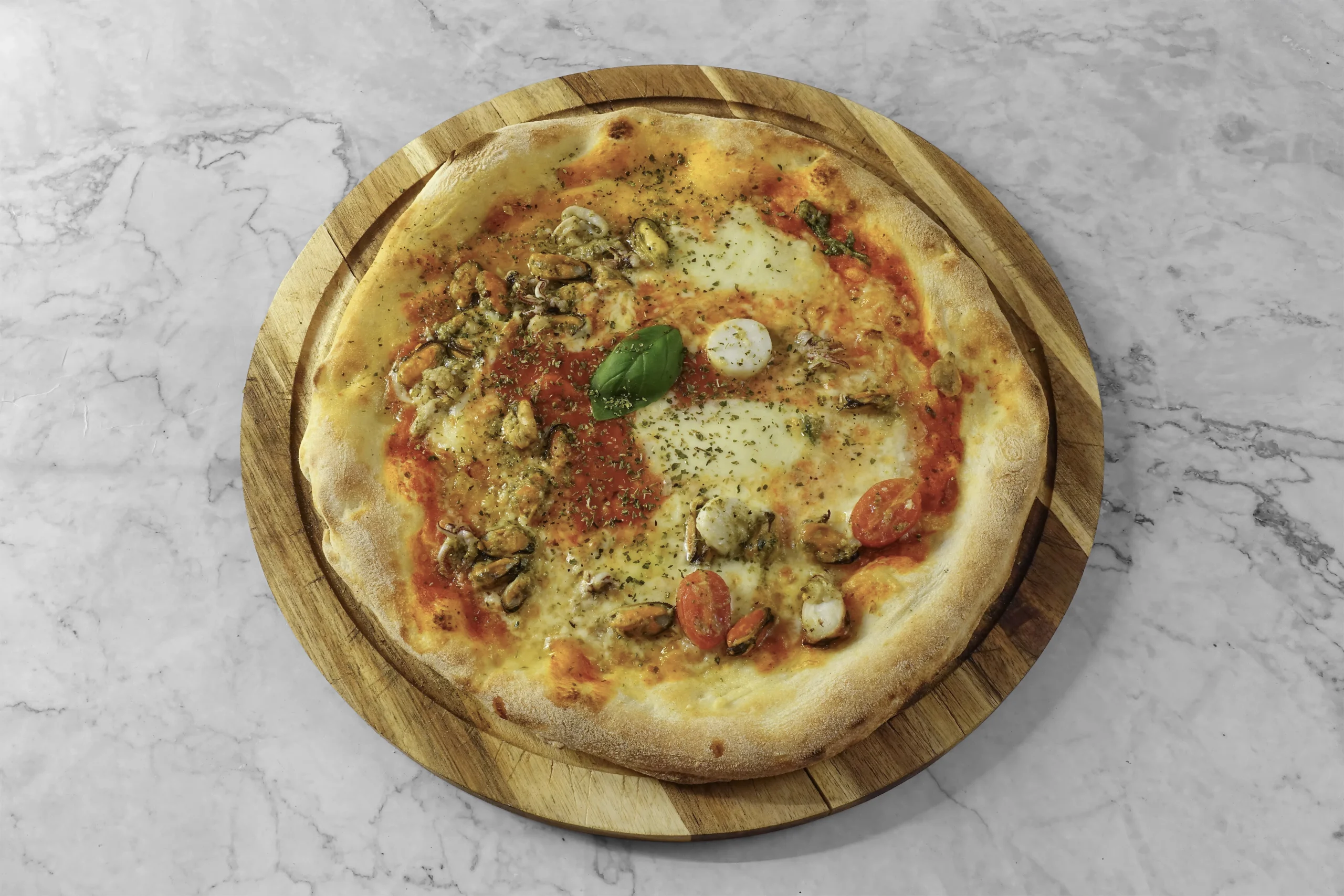 Tomatensoße, cremiger Mozzarella-Käse, zartes Kalamar, saftige Garnelen, delikater Oktopus, aromatische Muscheln